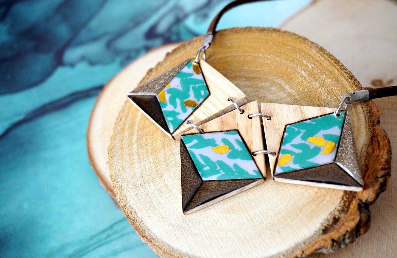 Chaque collier est fait à la main. Ce modèle à une mise en couleur par collage directement appliqué sur le bois. Ce dernier est résiné par la suite afin de protéger la mise en couleur de la pièce.